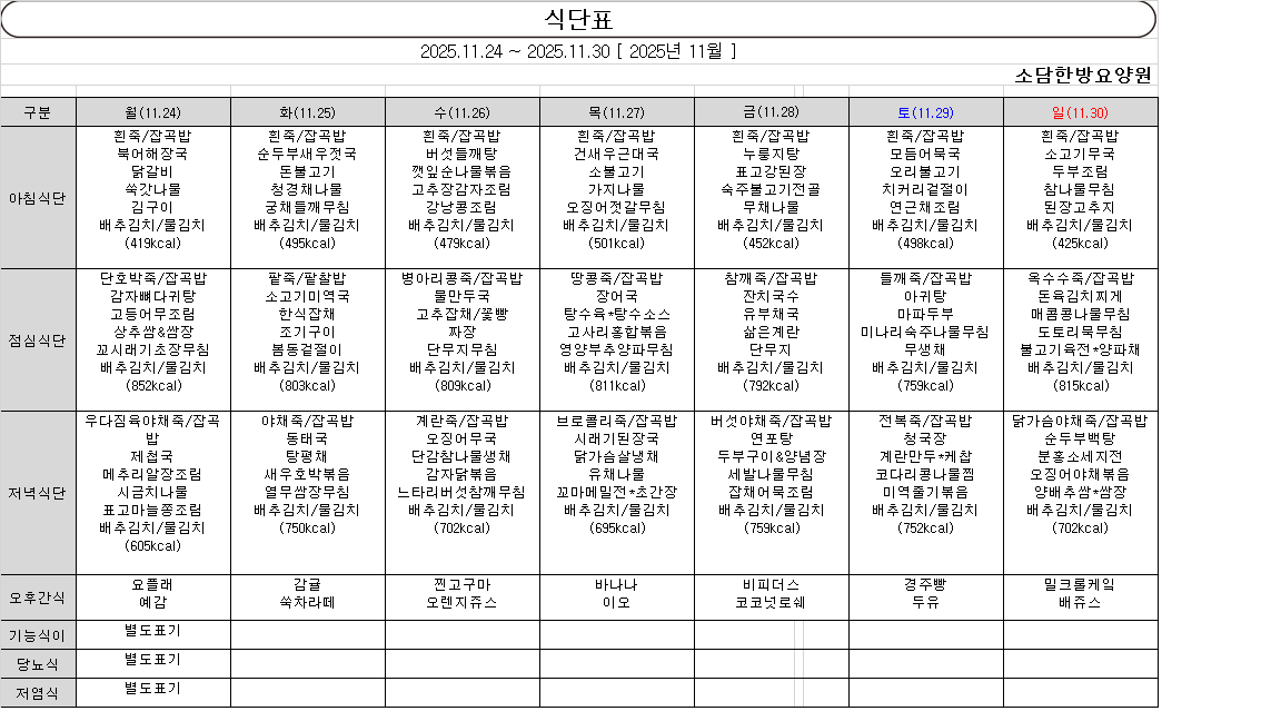 작성 2025-11-19 17:50:58, 조회 20 11월 4주차 주간 식단표 입니다.소담한방요양원