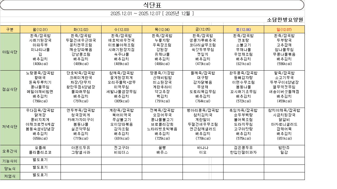 작성 2025-11-26 11:54:49, 조회 19 12월 1주차 주간 식단표 입니다.소담한방요양원