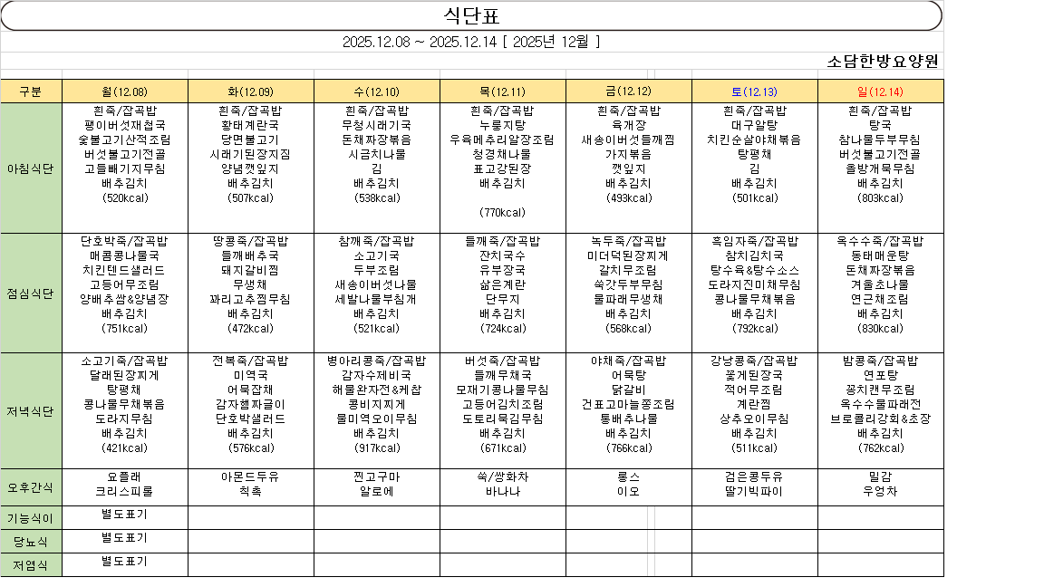 작성 2025-12-02 14:04:32, 조회 23 12월 2주차 주간 식단표 입니다.소담한방요양원
