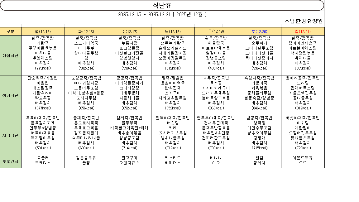 작성 2025-12-11 10:21:51, 조회 11 12월 3주차 주간 식단표 입니다.소담한방요양원
