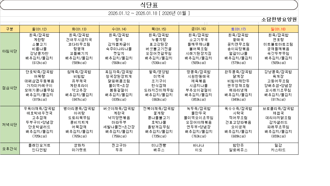 작성 2026-01-08 11:39:52, 조회 57 1월 2주차 주간 식단표 입니다.소담한방요양원