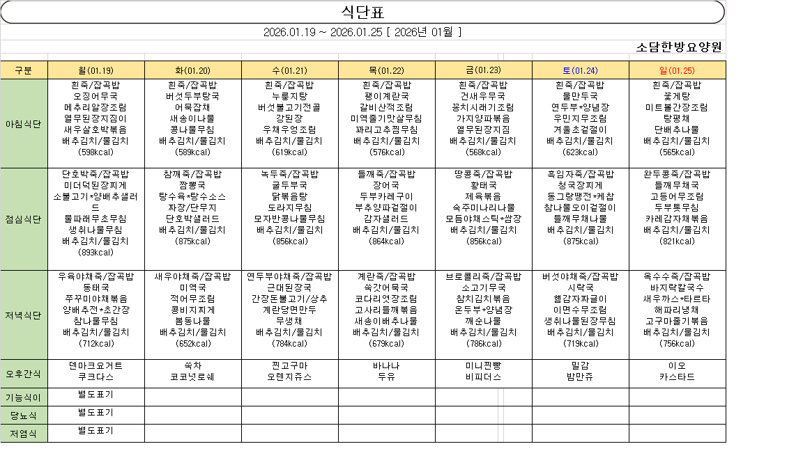 작성 2026-01-14 14:09:27, 조회 46 1월 3주차 주간 식단표 입니다.소담한방요양원