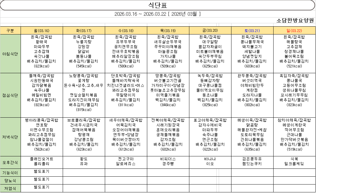 3월 3주차 주간식단표입니다. 작성자 소담한방요양원, 작성일 2026-03-11 17:14:18, 조회 16 |